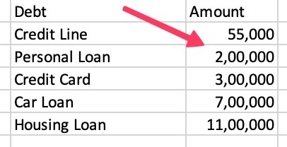 To do the snowball method, you’ll need to organize your debts from smallest to largest by amount.